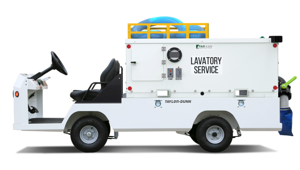 The Taylor-Dunn Bigfoot XL lavatory service truck handles aircraft waste removal and blue water replenishment in one self-contained unit. With 215-gallon total capacity and all aircraft service couplings included, together ground crews complete a full lavatory service turn without a separate support vehicle, which keeps turn times short and efficient between flights.