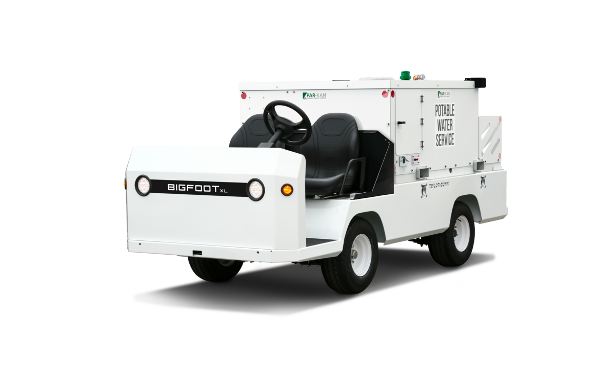 The Taylor-Dunn Bigfoot XL potable water service truck delivers fresh aircraft water service from a single self-contained unit with no tender vehicle required. The truck features a large clean-out access hatch which simplifies tank sanitation between services. Additionally, it includes fork pockets which allow the unit to be repositioned by forklift when ramp configuration changes between flights.